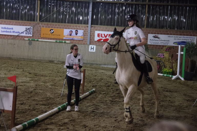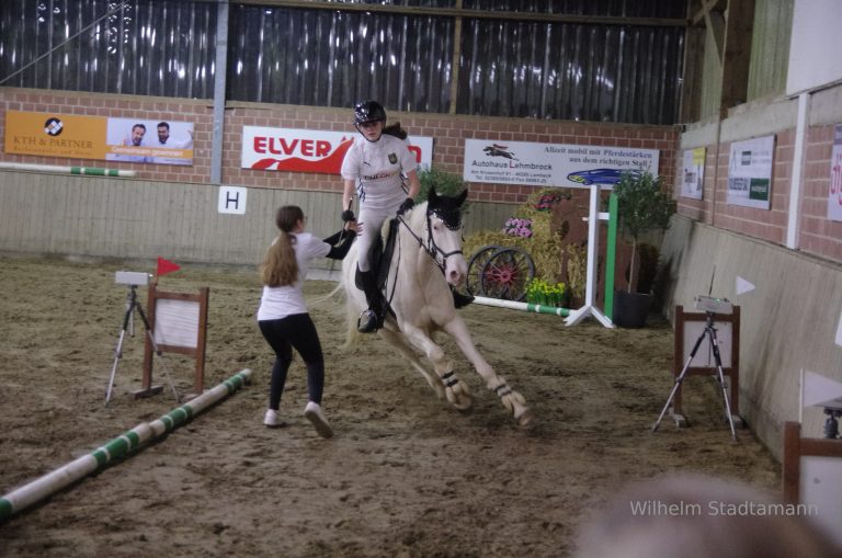 Bereits am Freitag startete das die jährige Winterturnier mit einem Gewöhnungsspringen und verminderten Anforderungen. Eine Plazierung fand nicht statt. So konnten junge Pferde mit einer Turnieratmosphäre vertraut werden. Nach Springpferdeprüfungen gab es einige Dressur Prüfungen und Reiterwettbewerbe. Durch die große Zahl der angetretenen Reiter endete die letzte Prüfung erst nach 21:00. Der Samstag gehörte dann ganz den Springreitern mit Prüfungen von E bis M Niveau. Vor allem bei der L-Stil-Springprüfung fieberten die Lembecker mit, denn bereits als 4. Starterin setzte sich Maria Elisabeth Schulte Spechtel mit Soraya in Red und einer Wertnote von 8.20 in Führung. Erst nach dem letzten Starter stand dann fest, das sie bei der Siegerehrung die goldene Schleife in Empfang nehmen durfte. Nach der folgenden M-Stil-Springprüfung fand dann der beliebte „Jump and Run“ Wettbewerb statt. Unter begeisterten Anfeuerungsrufen galt es für ein Starterpaar zunächst den Pacours mit Pferd und nach Übergabe der Gerte zu Fuß zu bewältigen.
